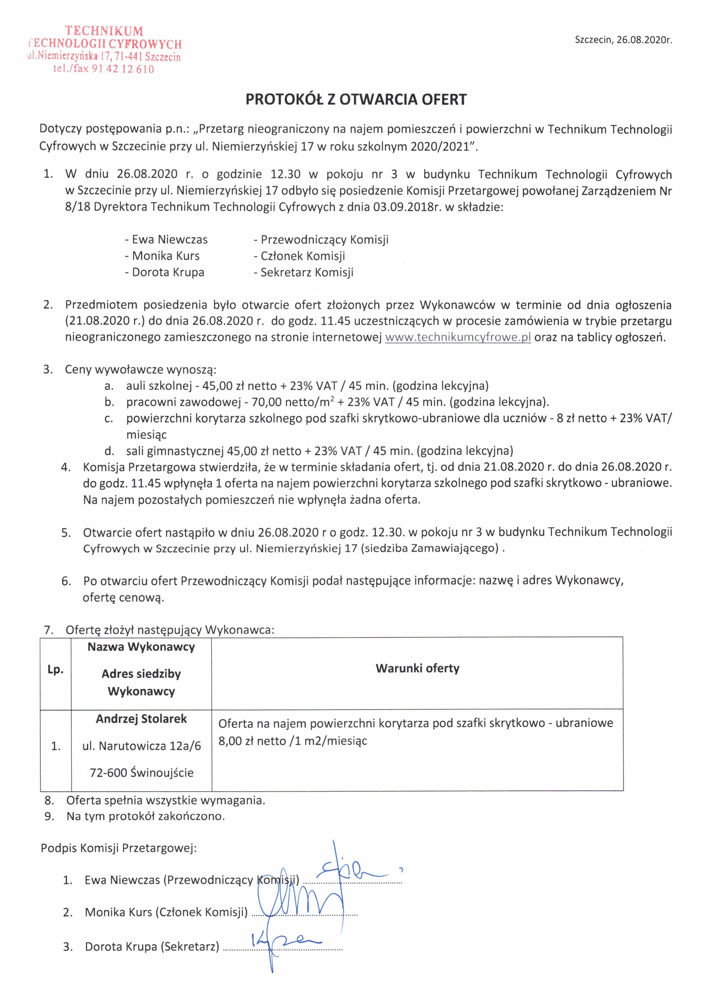 Dyrektor TECHNIKUM TECHNOLOGII CYFROWYCH w SZCZECINIE zaprasza do udziału w przetargu na wynajem pomieszczeń i powierzchni w budynku Technikum Technologii Cyfrowych w Szczecinie.