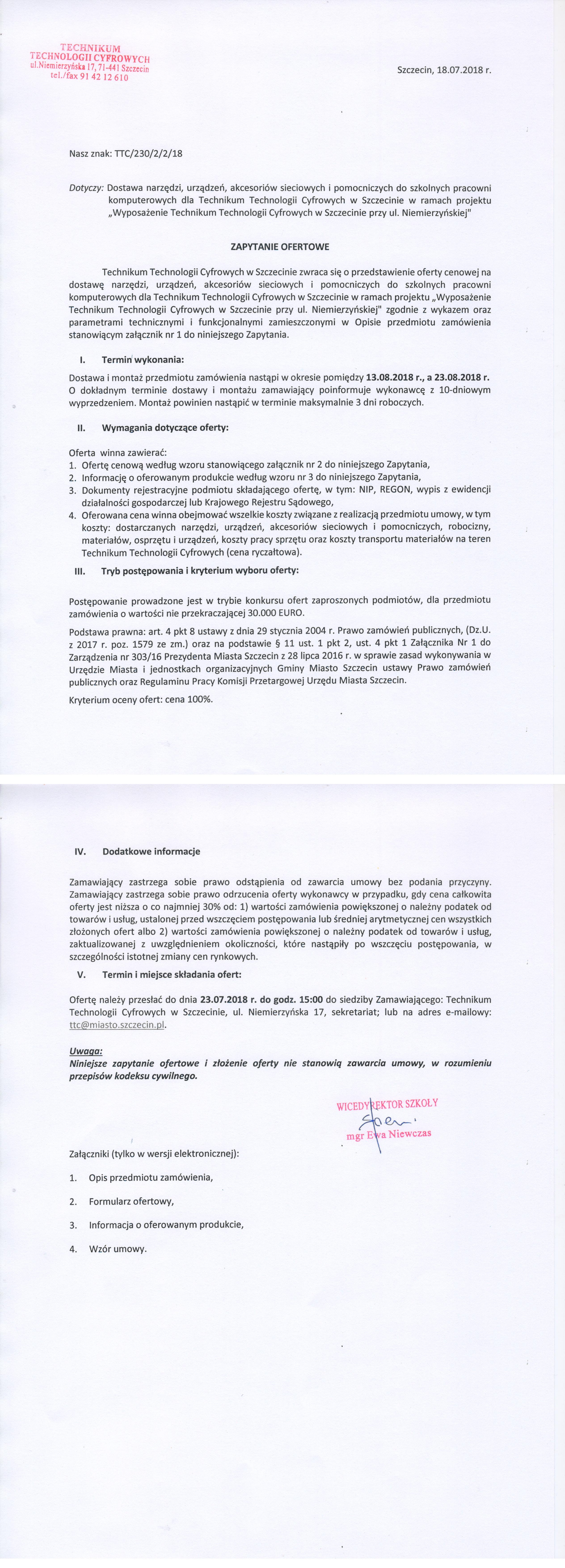 Dyrektor Technikum Technologii Cyfrowych w Szczecinie zaprasza do złożenia oferty cenowej na dostawę narzędzi, urządzeń, akcesoriów sieciowych do szkolnych pracowni komputerowych dla TTC w ramach projektu "Wyposażenie Technikum Technologii Cyfrowych w Szczecinie przy ul. Niemierzyńskiej".